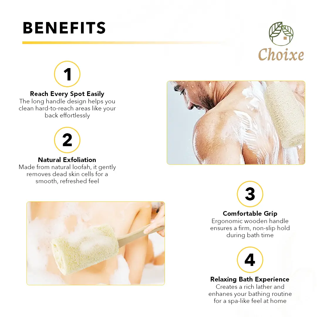 All-natural, eco-friendly, zero-waste loofah with a long handler can be used for bathing or showering, body scrubbing removal, and leaving skin soft and smooth.