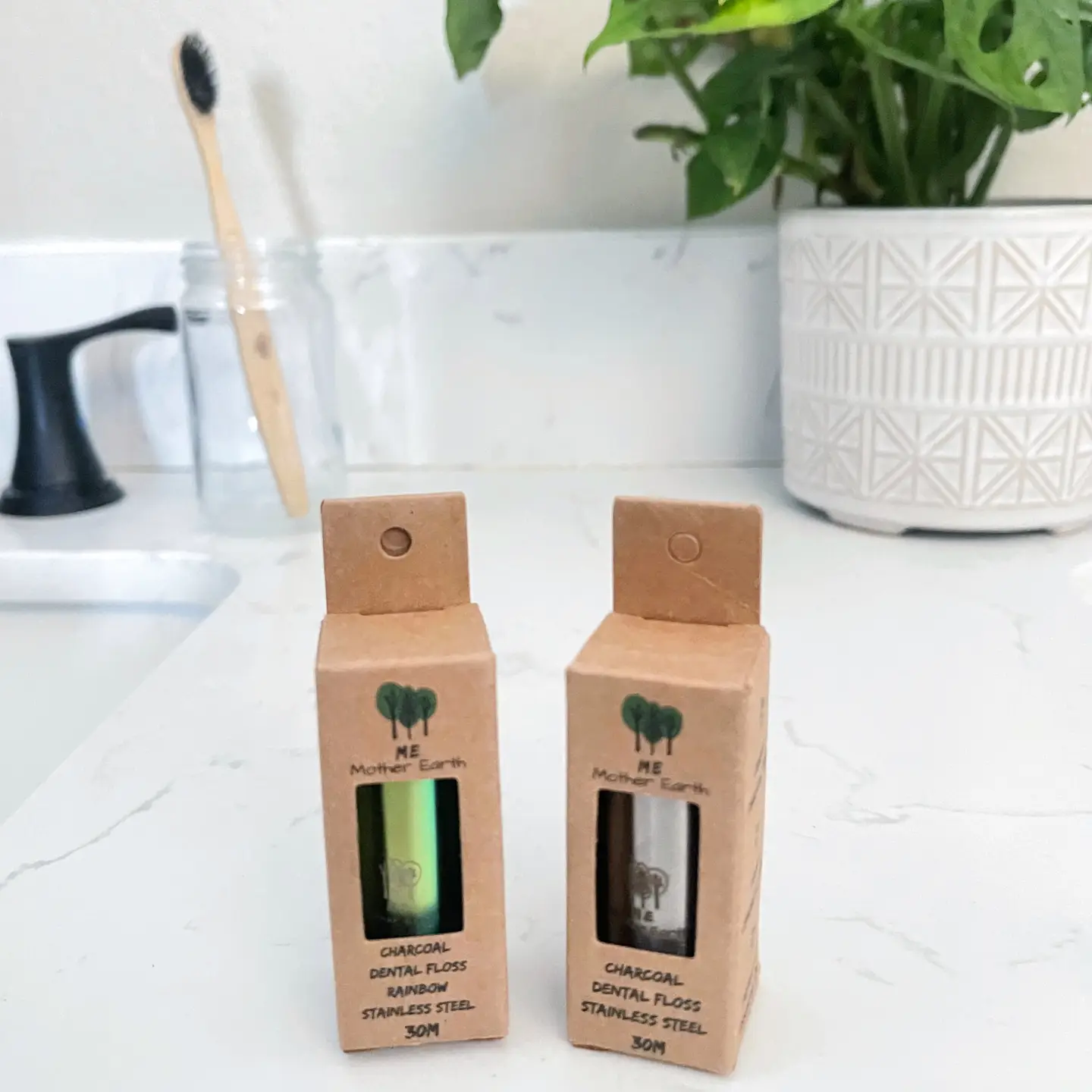 Feel guilt-free buying our Biodegradable Vegan Bamboo Charcoal Dental Floss with Refillable Stainless Steel Container, Rainbow Stainless Steel Container, OR limited edition gold OR Black stainless steel container.